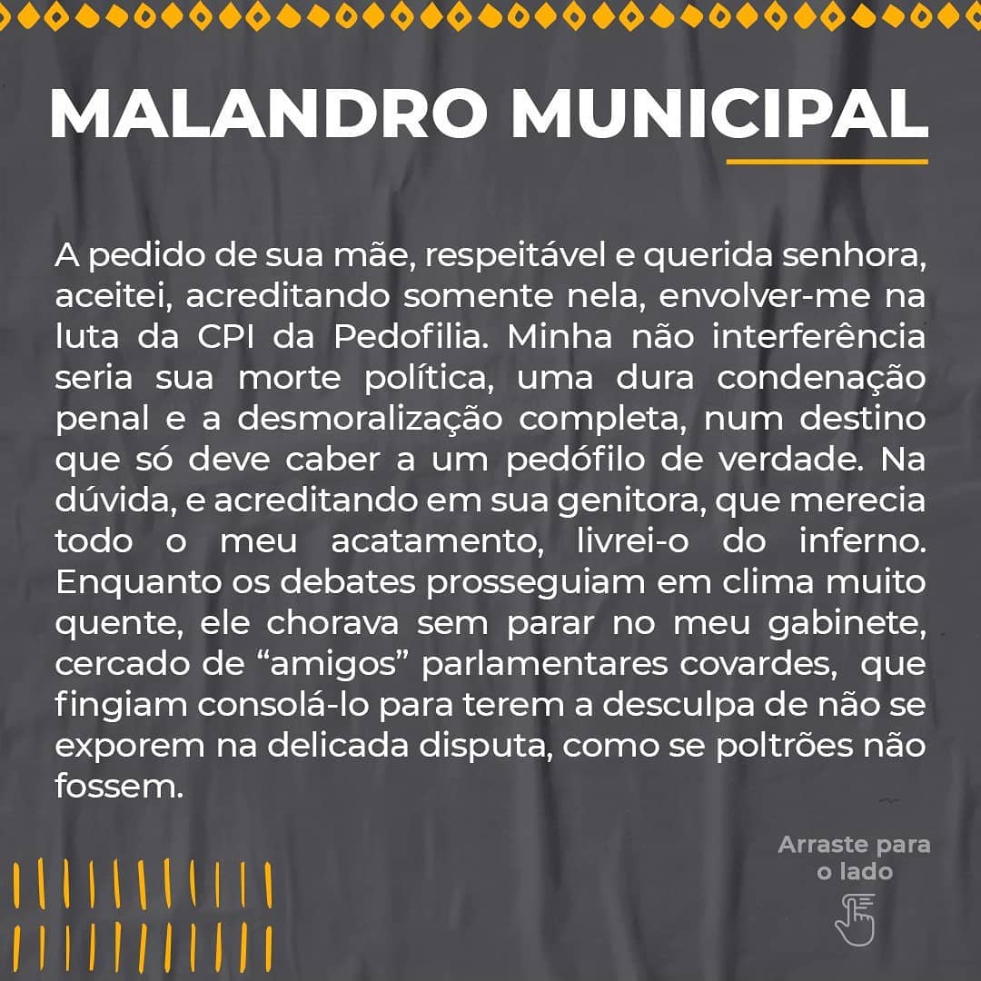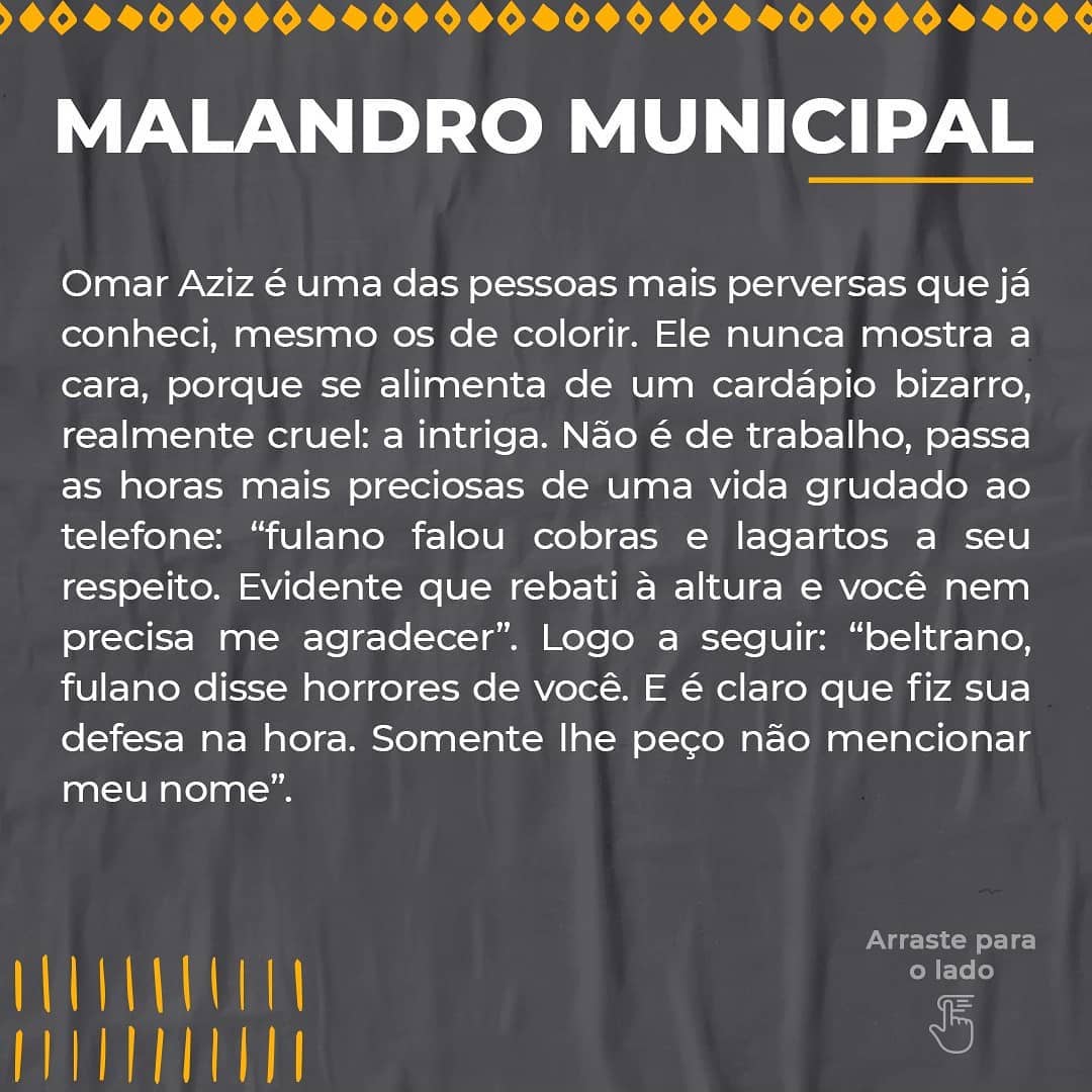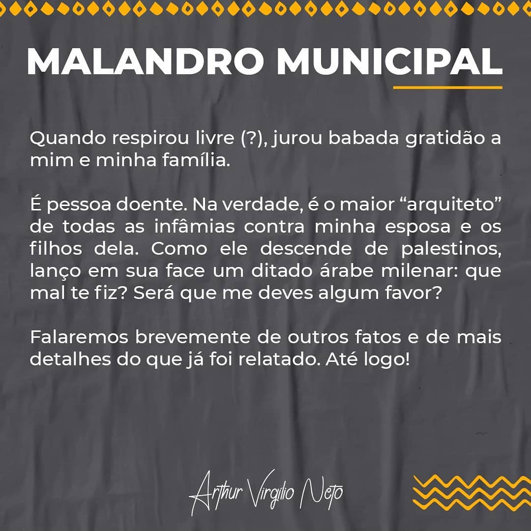 Em suas redes sociais, o ex-prefeito de Manaus, Arthur Virgílio Neto, publicou uma nota chamando o senador Omar Aziz de “malandro municipal”, uma das pessoas mais perversas que já conheceu. “Ele nunca mostra a cara, porque se alimenta de um cardápio bizarro, realmente cruel: a intriga. A pedido de sua mãe, respeitável e querida senhora, aceitei, acreditando somente nela, envolver-me na luta da CPI da Pedofilia. Minha não interferência seria sua morte política, uma dura condenação penal e a desmoralização completa. Falaremos brevemente de outros fatos e de mais detalhes do que já foi relatado”. A publicação feita ontem à noite nas redes sociais traz uma nota onde Arthur relata fatos envolvendo o senador, a quem diz ser incapaz de fazer amizades sem expor a si próprio ao ridículo. “Quando pede favor a alguém, porta-se como uma gueixa obediente. E quando se sente com poder, vira um grosseirão sem o menor respeito por quem esteja hierarquicamente abaixo dele”. Sobre a CPI da Pedofilia, o ex-prefeito afirmou que sua não interferência resultaria na morte polícia e dura condenação de Omar, além de desmoralização completa, “num destino que só deve caber a um pedófilo de verdade”. O tucano revela que agiu atendendo a pedido da mãe de Aziz, inconsolável. “É uma pessoa doente (Omar). Na verdade, é o maior ‘arquiteto’ de todas as infâmias contra minha esposa e os filhos dela”.