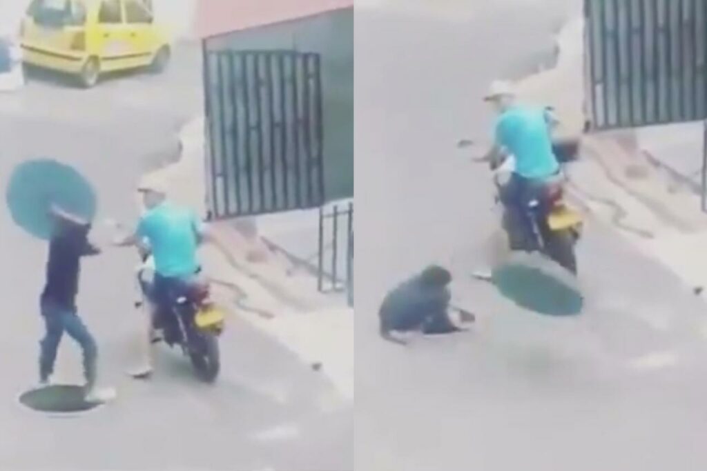 um vídeo onde mostra o exato momento em que um bandido cai dentro do esgoto enquanto tentava roubar a tampa do bueiro. O caso aconteceu em Medelín, na Colômbia.
