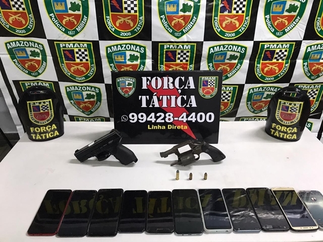 Após revista e busca no interior do automóvel, foram encontrados com eles um revólver calibre 38, marca Stanley Brasil, numeração 1392486, com três munições calibre 38 intactas; um simulacro de pistola; além de 11 aparelhos celulares de marcas diversas, que posteriormente foi constatado serem provenientes de roubo praticado pelo grupo no Conjunto Japiinlândia, bairro Japiim.