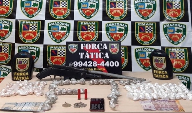 Segundo informações da Força Tática, os militares faziam patrulhamento de rotina pela rua Marajoara quando avistaram um homem em atitude suspeita, que tentou fugiu ao perceber a aproximação da equipe policial, carregando uma sacola. A guarnição fez o acompanhamento e capturou o indivíduo em frente à residência dele.