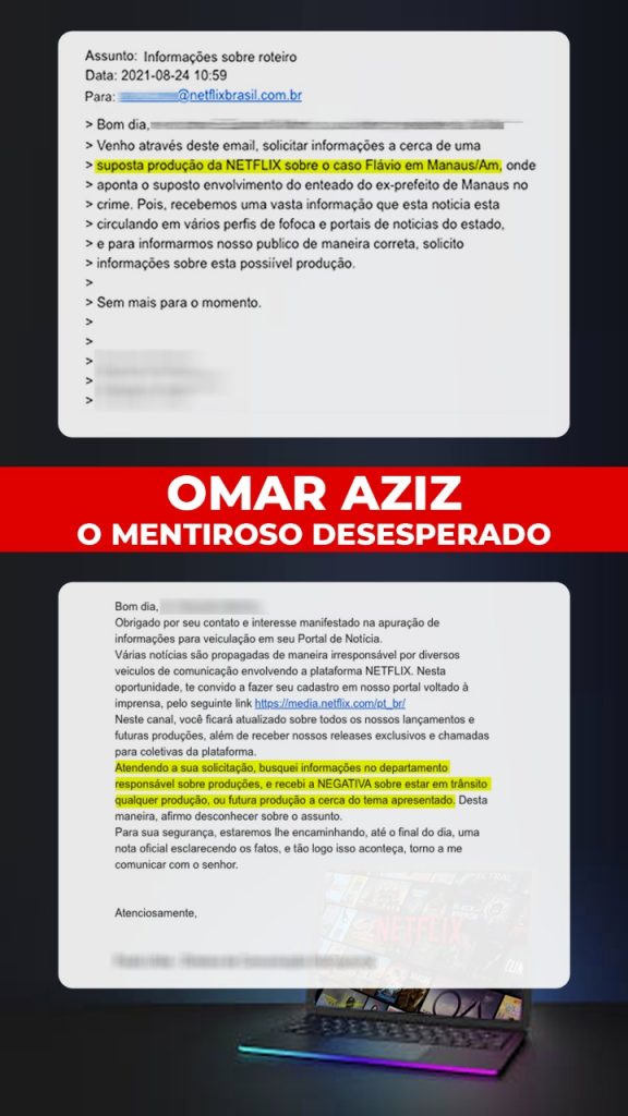 Depois de ter sido desmasarado por vazar documentos sigilosos da CPI da Pandemia, com risco de ser preso, Omar Aziz (mais conhecido como o senador Omala) agora tenta espalhar mais uma fake news. Sonhando em se reeleger ao senado, ele tenta desviar a atenção da mídia local contra seus desafetos políticos. Desde ontem circula em grupos de whats, a informação de que a Netflix estaria interessada em fazer um documentário sobre o caso Flávio. UMA GRANDE MENTIRA!