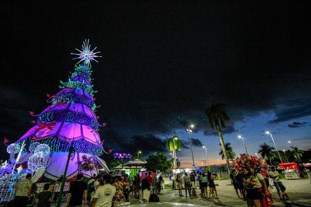 Em continuidade à programação do “Natal do Abraço”, da Prefeitura de Manaus, mais uma grande árvore foi entregue à população da capital. Nesta terça-feira, 8/12, foi a vez do complexo turístico da Ponta Negra, na zona Oeste, receber as cores e o brilho da campanha natalina. De autoria do artista plástico parintinense Juarez Lima, a árvore é a maior dessa edição, com 35 metros de altura e 15 metros de largura em sua base e foi acesa às 18h.