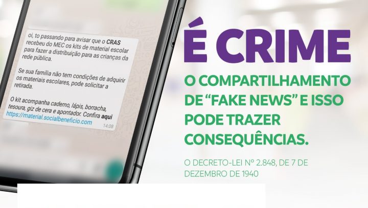 A mensagem diz que as famílias que não têm condições de adquirir os materiais escolares podem solicitar a retirada em um Centro de Referência de Assistência Social (Cras). O texto ainda disponibiliza um link no qual as pessoas podem consultar mais informações.